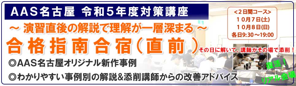 2日目:事例Ⅲ を解く AAS名古屋オリジナル新作事例 本番同様の雰囲気の中、80分で事例問題に挑戦します。 |