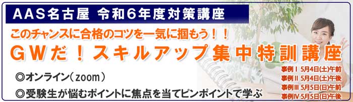 ・本講座をお申込みの方全員へもれなくプレゼント!! 鷺山はるこの個別指導による、「設問分解ミニ講座(60分)」を無料で受講いただけます。講座が終了しましたら、受講生の方お一人ずつに、鷺山はるこから直接、指導日のご案内を差し上げます。 GWに合格のコツを学び、その後は、無料の個別レッスンも受けられる、この機会をぜひご利用くださいね! |