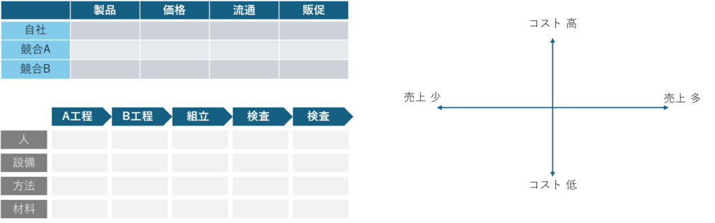 表形式だったり、マトリクス形式のものなどありますが、2軸で考えるとMECEに論点を洗い出しやすく、複雑な情報も構造的に整理できます。