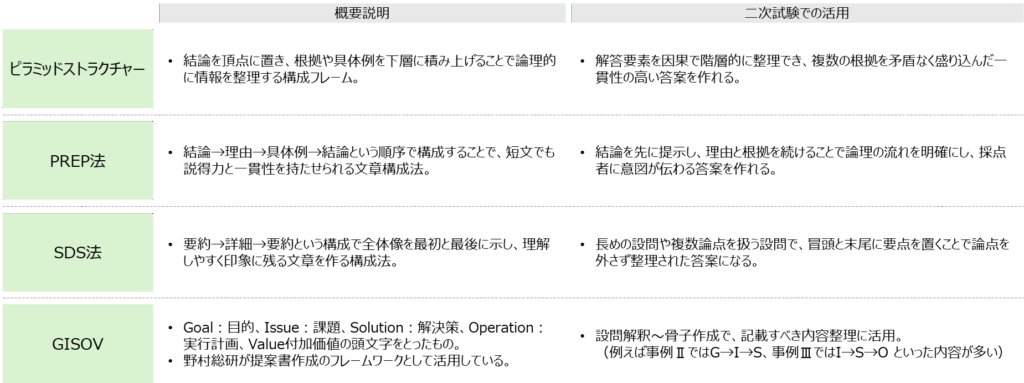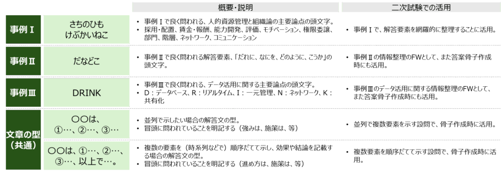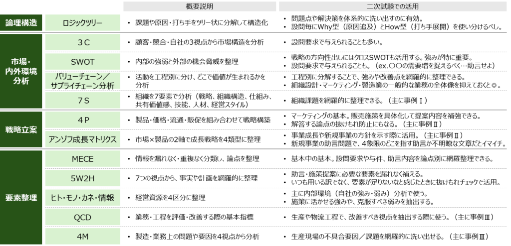 今回は、私自身が二次試験に役立ったと思うものを中心に、フレームワークの活用法をご紹介します。